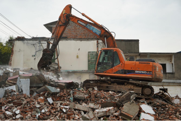 拆除现场,在拉起的警戒线内,一辆大型破拆机械挥舞着“铁臂”开始对房屋进行拆除作业,不断抛落的断砖碎瓦激起滚滚粉尘,旁边一辆洒水车开始喷射出高压雾状水花对腾起的拆迁粉尘进行浇洒,将粉尘渐渐覆盖降至地面,减少拆迁施工对周边居民的扬尘侵扰。本次拆除涉及5户房屋、面积600余平米。