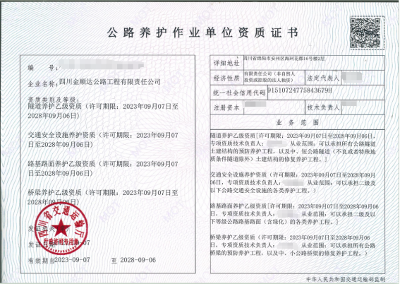近日,四川金顺达公路工程有限责任公司资质申报工作传来捷报,经四川省交通运输厅核准,公司申报的路基路面、隧道、交通安全设施、桥梁养护乙级资质成功获批并取得证书,成为安州区唯一取得该项资质的企业,也是绵阳市第一家同时申报全部四项资质并通过的企业。