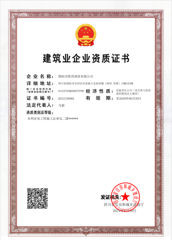 近期,经四川省住房和城乡建设厅严格审核批准,威廉体育下属子公司绵阳市凯邦商贸有限公司成功荣获“水利水电工程施工总承包二级资质”证书。