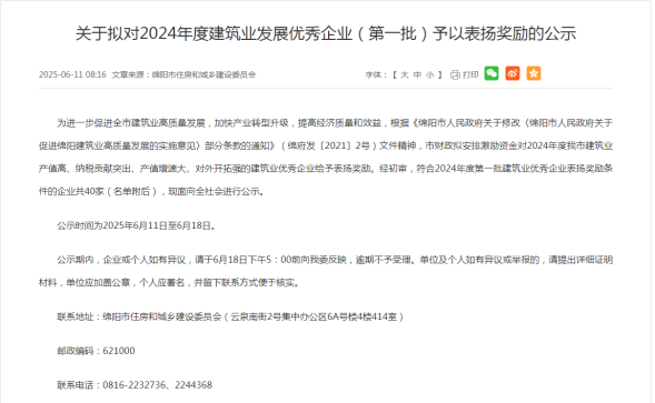 近日,绵阳市住房和城乡建设委员会发布《关于拟对2024年度建筑业发展优秀企业(第一批)予以表扬奖励的公示》,威廉体育下属子公司——四川中新海川建设有限公司与四川金顺达公路工程有限责任公司凭借卓越的综合实力与突出贡献,双双入选首批40家拟表扬奖励企业名单。