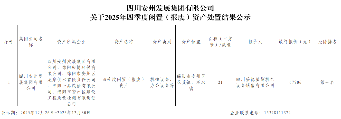 威廉体育 关于2025年四季度闲置(报废)资产处置结果公示
